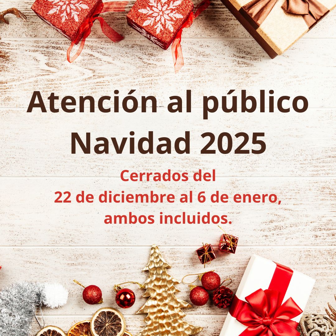 ATENCIÓN AL PÚBLICO NAVIDAD 2025 Cerrados del 22 de diciembre al 6 de enero, ambos incluidos. ¡Felices Fiestas!